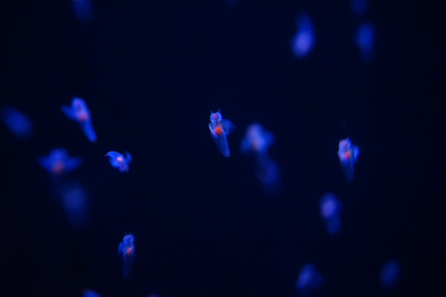 体は透明でガラス細工のような繊細さがあり、内臓がオレンジ色や赤色に透けて見えます。この色合いが体の中心に浮かび上がることで、より幻想的な印象を与えているのでしょう。