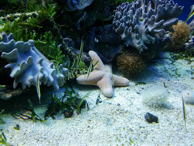 アオヒトデは名前の通り、鮮やかな青色の体を持つ美しいヒトデです。この青色は他のヒトデにはあまり見られず、海の中でもひときわ目立ちます。体の大きさは10〜15cmほどで、5本の腕を持ちます。