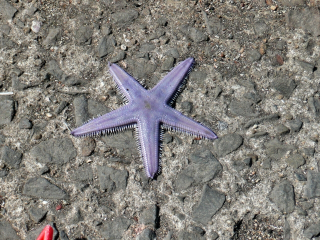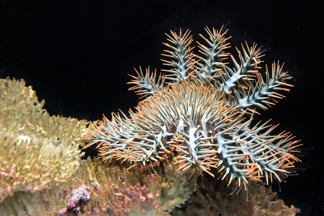 体の大きさは30〜50cmにもなり、腕は10本以上あることが一般的です。体色は青から赤紫色で、トゲは赤みがかっています。サンゴ礁に生息しており、サンゴのポリプを食べて生きています。大量発生するとサンゴ礁に大きな被害を与えるため、生態系への影響が懸念されているヒトデです。