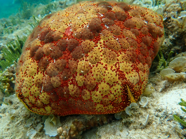 ヤマトナンカイヒトデは全身が細かいトゲでびっしりと覆われた、独特の質感を持つヒトデです。体の大きさは15〜25cmで、5本の腕を持ち、赤や黄色の体色をしています。