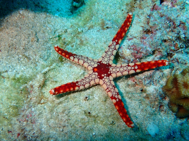 イトマキヒトデは赤やオレンジのまだら模様が美しいヒトデです。腕は5本ありますが、それほど長くはなく、キレイな星形をしています。まだら模様の入り方は個体によって異なり、それぞれに個性があります。
