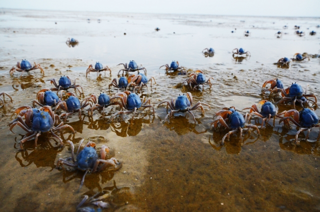 シオマネキは干潟に生息する3~4cmの小さなカニです。オスの片方のハサミが大きく発達しており、これを振ってメスにアピールします。まるで手招きしているように見えるため『シオマネキ(潮招き)』という名前がつきました。繁殖期にオスが一斉にハサミを振る光景は壮観です。