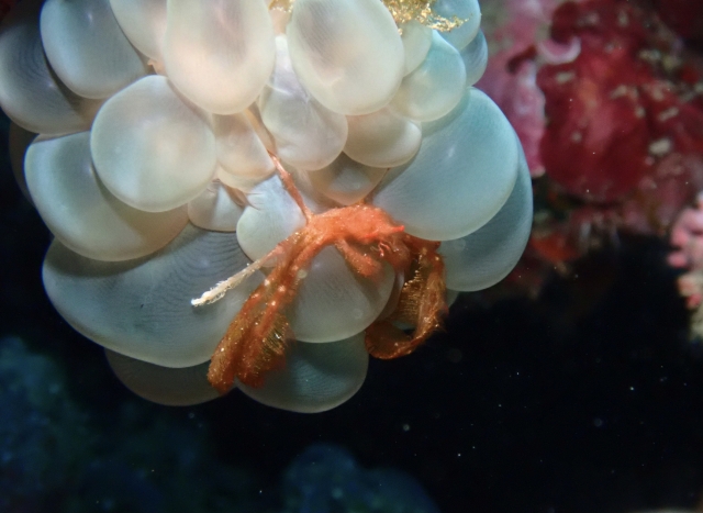 正式和名は『ミナミクモガニ』ですが、長い間和名が無く今もオランウータンクラブと呼ばれることが多いです。フサフサとした毛に見えるのは、実は藻類です。隠れているサンゴによって色や長さが違い、上手に隠れています。