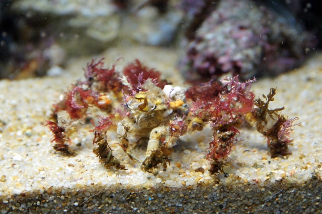 モクズショイは体に海藻やカイメン、貝殻などを貼りつけて擬態する習性を持ちますそのため『藻屑背負い(モクズショイ)』と名付けられました。外敵から身を守るための工夫ですが、色とりどりのものを身に着けている姿は、まるでおしゃれをしているようにも見えます。