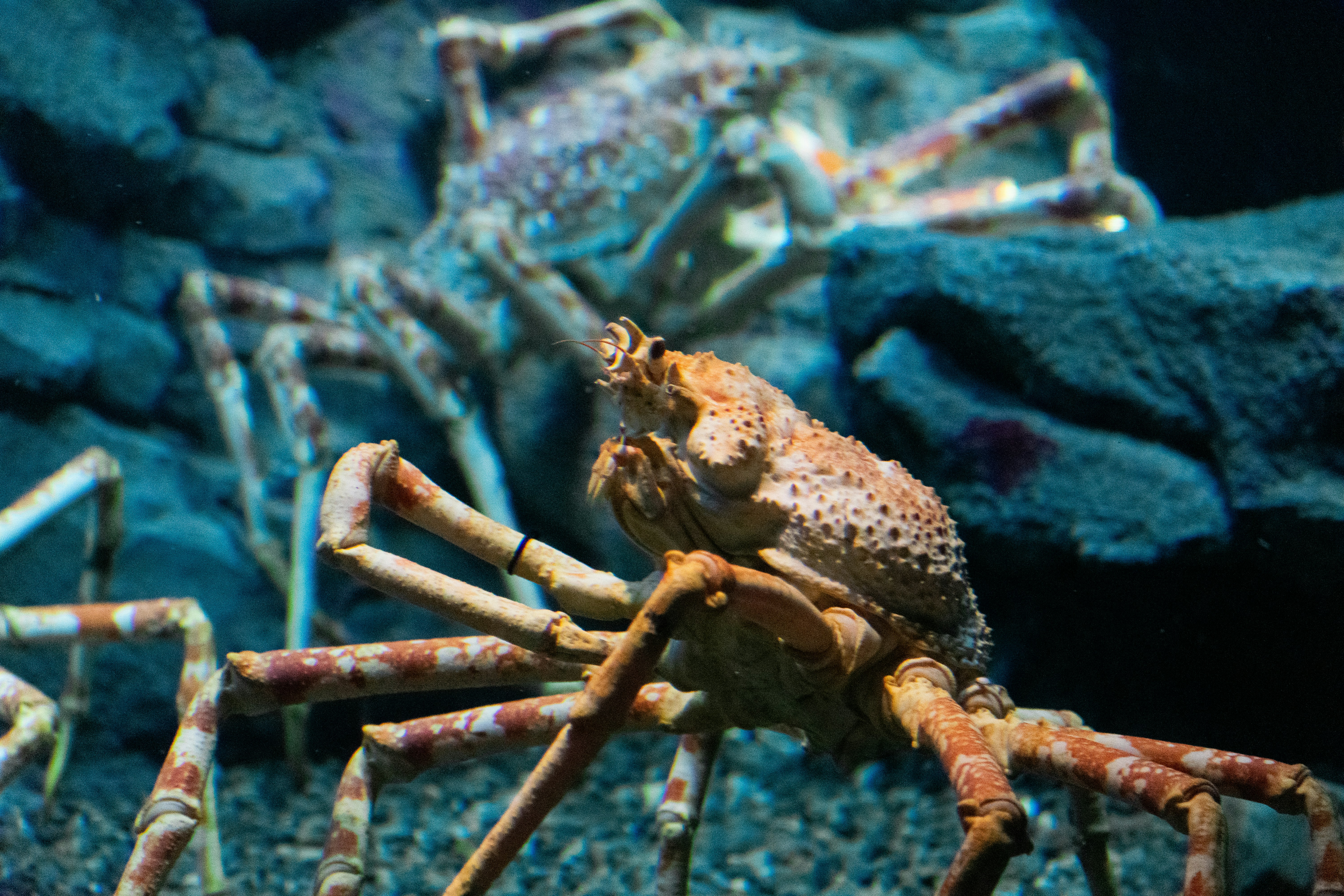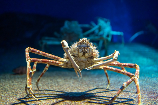 タカアシガニは深海に生息し、脚を広げると3mを超える世界最大のカニです。長い脚をゆっくりと動かしながら歩く姿は圧倒的な存在感があります。タカアシガニが漁獲される静岡県沼津市では、食べた後の甲羅に鬼や動物の顔を描き、玄関に飾って魔除けにする風習があります。