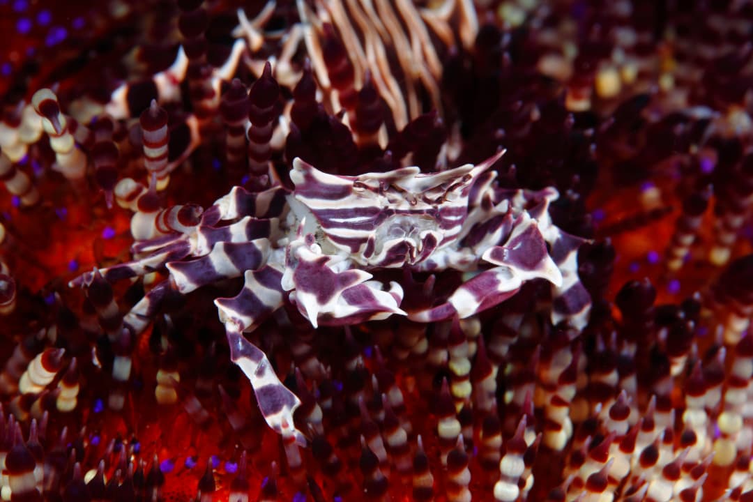 ゼブラガニは体長2〜3センチほどの小型種で、名前のとおり白黒の縞模様が特徴です。ラッパウニやイイジマフクロウニに寄生し、トゲを刈り取って食べます。刈り取ってできた隙間に身を隠し、トゲで守ってもらいます。一度寄生してしまえば、しばらくは食べ物と住むところに困らないのです。