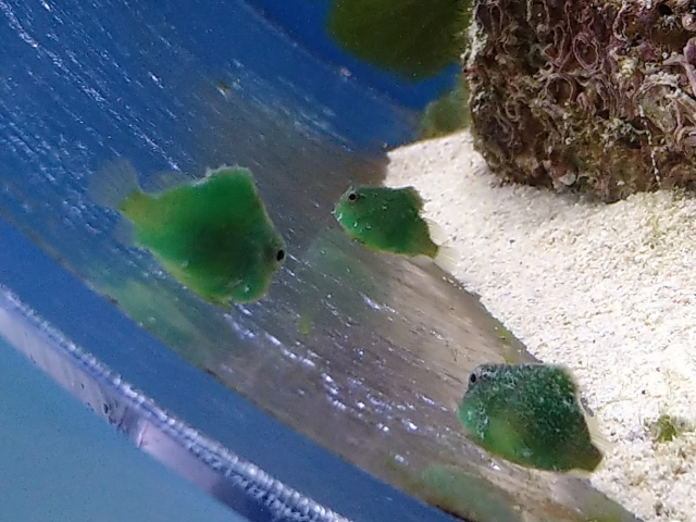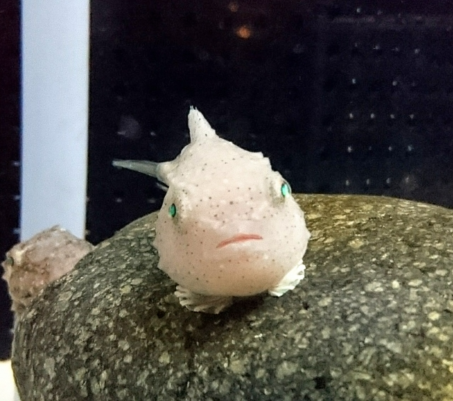 フウセンウオよりもひと周り大きく、体長は最大で15cmほどです。オスはメスよりも小さく、体の突起も少ないのが特徴。繁殖期になるとメスが貝殻などに卵を産み、オスは貝殻の中に入って卵を守ります。