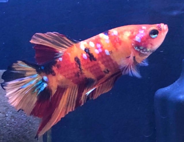 ハーフムーンは、尾ビレを広げたときに半円形になることからその名が付けられました。ヒレが大きく広がる姿は圧巻で、観賞価値が非常に高い品種です。色彩も豊富で、単色から複数色が混ざったマーブル模様まで多様な個体が流通しています。