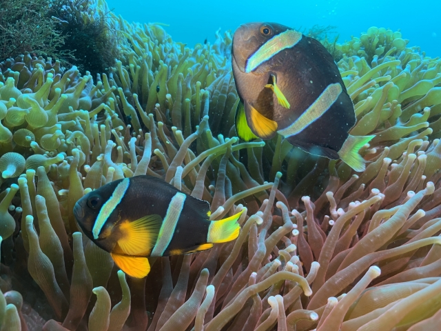観察の際は、ストレスを与えないよう、適度な距離を保ちましょう。ハマクマノミやトウアカクマノミは攻撃してくることもあるので注意してください。
