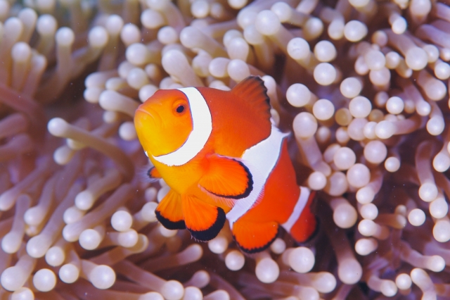 クマノミの最大の特徴は、イソギンチャクとの共生です。通常、毒をもつイソギンチャクの触手に魚がふれれば命を落とします。クマノミは特殊な粘液を持つことでイソギンチャクの毒の影響を受けないので、共生できるのです。