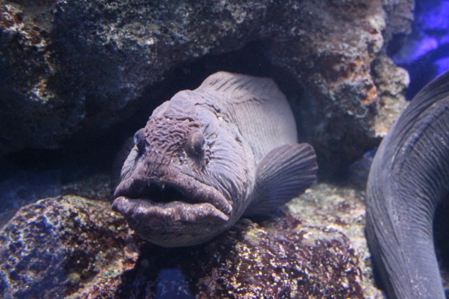 いずれにしても、巣穴から出ることがあまりないオオカミウオは、出会えればじっくりと観察できます。水槽越しでは分からない、オオカミウオの仕草や質感などを感じてみてください。