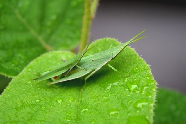 オンブバッタ科のオンブバッタは、オスの体長が約2cmなのに対し、メスの体長は約4cm。メスのほうがはるかに大きいのです。その名の通り、メスがオスをおんぶしているように見えることから名付けられました。