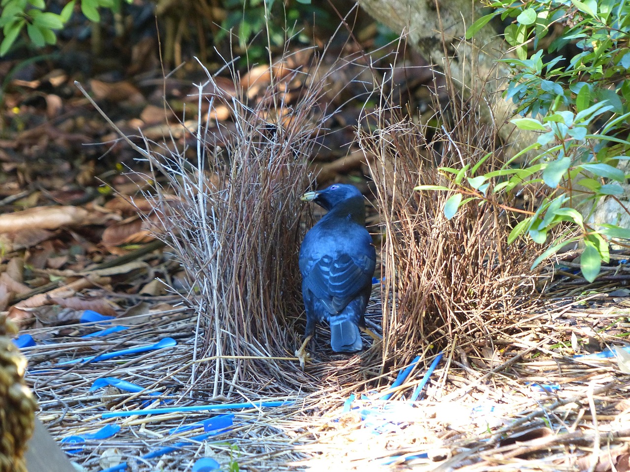 オーストラリア東部に分布サテンフウチョウのオスは、巣ではなく『展示専用の家』を作ります。特に、青いオブジェを好んで集めて飾ることで有名です。色や配置にも強いこだわりを見せます。