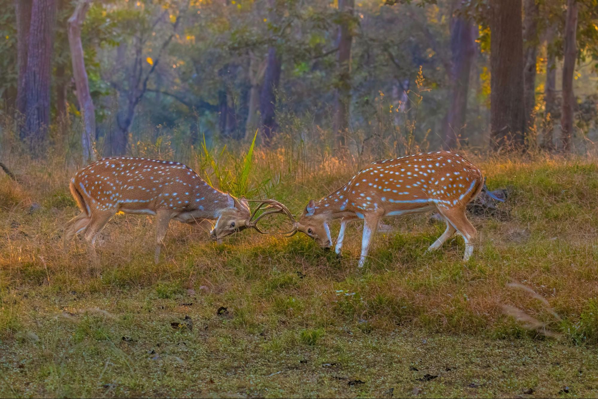 シカのオスは、メスをめぐって角をぶつけ合って争います。