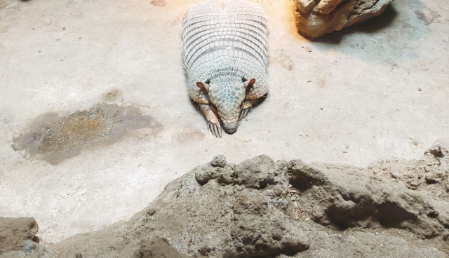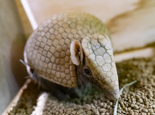 神戸どうぶつ王国では『マタコミツオビアルマジロ』が展示されています。この種は、アルマジロのなかでも数少ない『体を丸められる』種類で、防御姿勢をとる姿が見られることも。