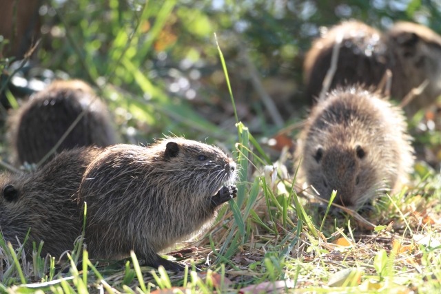 ヌートリアは主に夕方から夜にかけて活動します。昼間は岸辺の巣穴や草むらで休み、外敵の少ない夜にエサを探します。一匹で行動することもありますが、水辺には複数の巣穴を持ち、家族単位で生活することが多いのが特徴です。