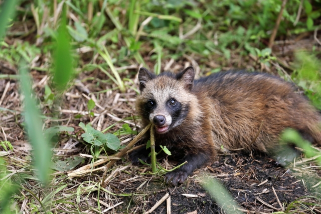 タヌキは基本的に夜行性ですが、食べ物が少ない時期には日中にも活動します。平野部・山林部・市街地と幅広いエリアに生息し、果実・植物・昆虫・小動物などを食べる雑食性の動物です。農作物だけではなく、悪臭や騒音などの被害も問題視されています。